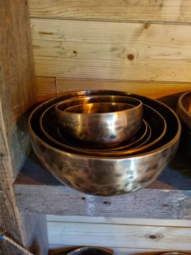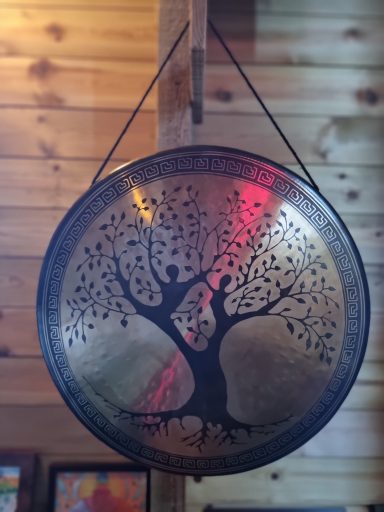 The learning area is a tranquil and transformative space. From the moment you walk in, it is evident something special happens here. You are surrounded by gongs of various sizes and different makes ranging from enormous to quite small. A vast array of singing bowls, crystal bowls, harp, flute, conch horn the list goes on.